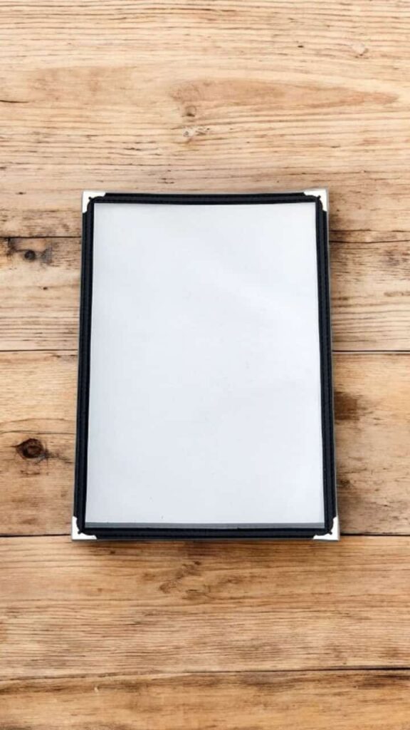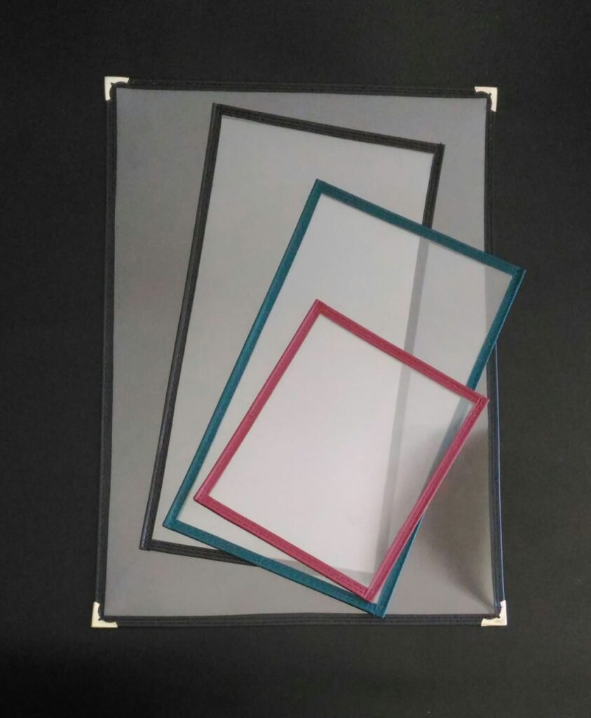 CARDÁPIO, CARTA DE VINHOS E SUPORTE PARA REGULAMENTO INTERNO EM PVC TRANSPARENTE COM VIÉS DA COR DE SUA PREFERÊNCIA COM DUPLA. COSTURA PARA COLOCAÇÃO DE SEU CARDÁPIO DE PAPEL E CANTONEIRAS METÁLICAS EM CADA DIVISÃO.