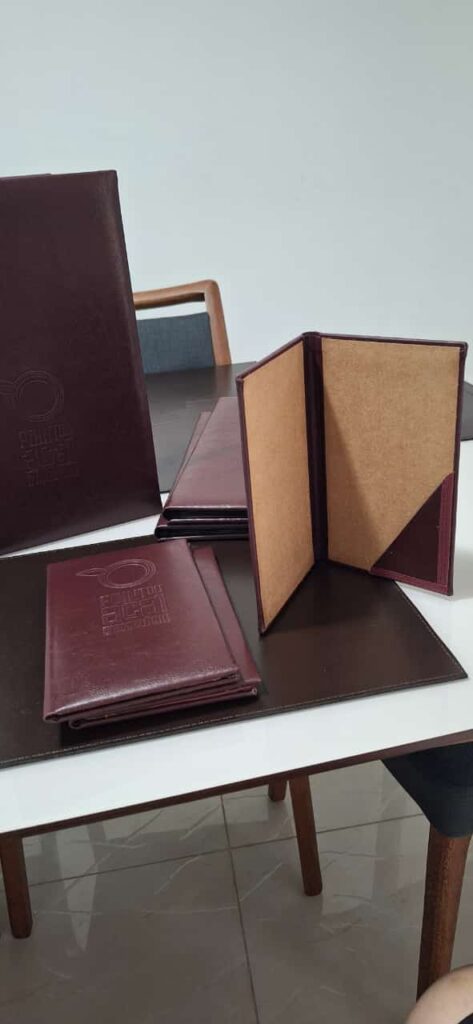 PORTA COMANDA, CARTEIRINHA DE LEVAR A CONTA NA MESA, É MAIS DISCRETO, FINO E EVITA QUE A MESA AO LADO VEJA A FORMA DE PAGAMENTO DE SEU CLIENTE, E ESSE PORTA CONTA TAMBEM VEM GRAVADO COM A LOGOMARCA.
